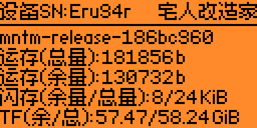 制作该程序的初衷是为了在汉化过程中随时查看系统信息,分析固件的优化情况。之前只在私下进行了分享,朋友觉得程序很方便,绑定快捷键以后可以随时查看系统信息。因此决定正式加入汉化固件之中,通过该程序可以随时了解运行内存,闪存以及TF卡的使用情况。因为是内部测试程序,姑且算是0.1版。